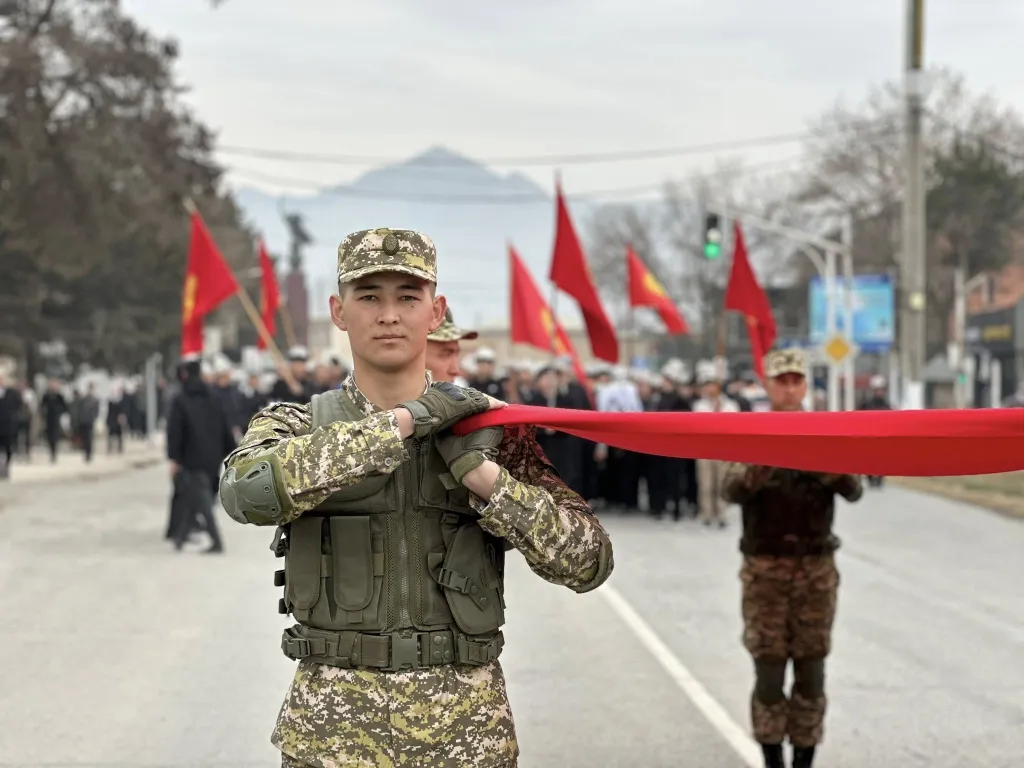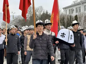 Ак калпак кийип, колдоруна туу көтөргөн жаштар шаардын борбордук көчөлөрүндө жөө жүрүш жасашты.