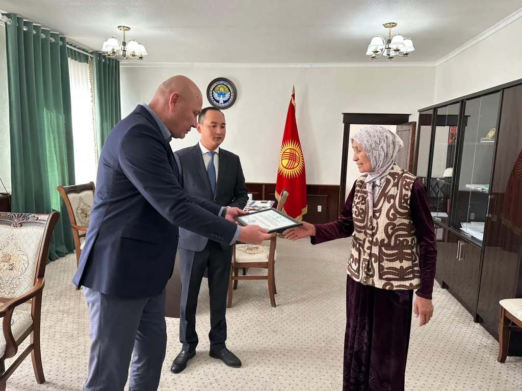 Президенттин Баткен облусундагы ыйгарым укуктуу өкүлү Айбек Шаменов Кадамжай районунун Ак-турпак айылынын тургуну Айсалкын Темировага 408 369 сом өлчөмүндө “Мамлекеттик Камсыздандыруу уюумунун” камсыздандыруу төлөмүнүн сертификатын тапшырды.